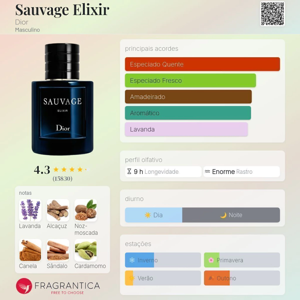 Sauvage Elixir de Dior é um perfume Aromático Masculino. Sauvage Elixir foi lançada em 2021. O perfumista que assina esta fragrância é François Demachy. As notas de topo são: Noz-moscada, Canela, Cardamomo e Toranja. A nota de coração é Lavanda. As notas de fundo são: Alcaçuz, Sândalo, Âmbar, Patchouli e Vetiver do Haiti